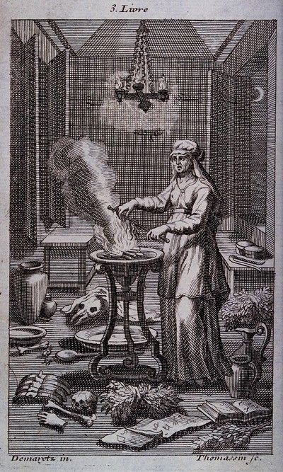 Image: A witch casting spells over a steaming cauldron. Engraving by H.S. Thomassin after Demaretz.